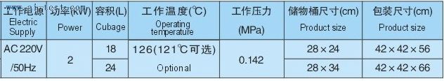 | A101133 | 手提式不銹鋼壓力蒸汽滅菌器(煤電兩用型、防干燒型):工作電源AC 220V/50Hz;功率:2kw;容積:18L;工作溫度(℃): 126℃(121℃可選);工作壓力:0.142MPa;儲物桶尺寸cm:28×24;包裝尺寸cm:42×42×56;品牌:中國 | 1 | 1250 | 洽詢 | 備注 | |