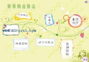 異常構音矯治:概括了推掌療法、半吞咽法、咀嚼法、重讀治療、響度控制、哈欠嘆息法及音調控制,七種矯治方法
